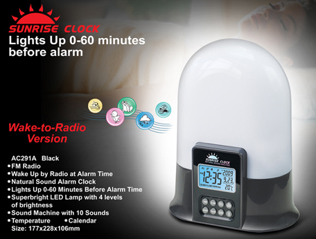 | SUNRISE CLOCK WITH FM RADIO,LIGHT UP 0-60 MINUTES BEFORE ALARM |