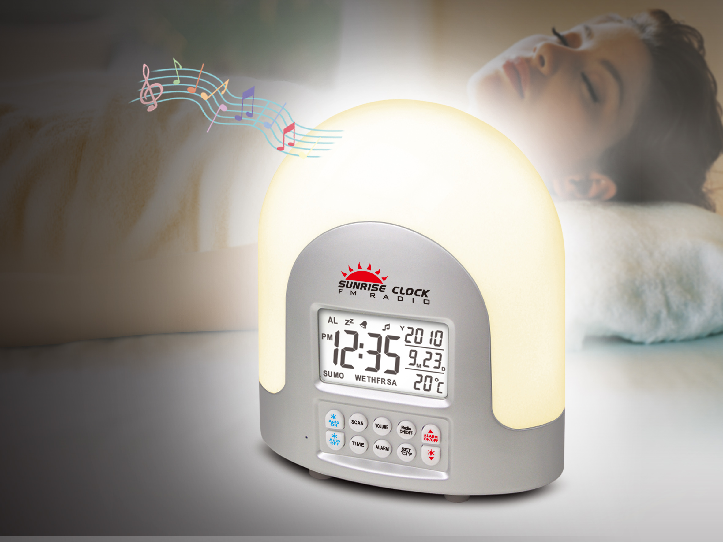 SUNRISE CLOCK WITH FM RADIO,LIGHT UP 0-60 MINUTES BEFORE ALARM